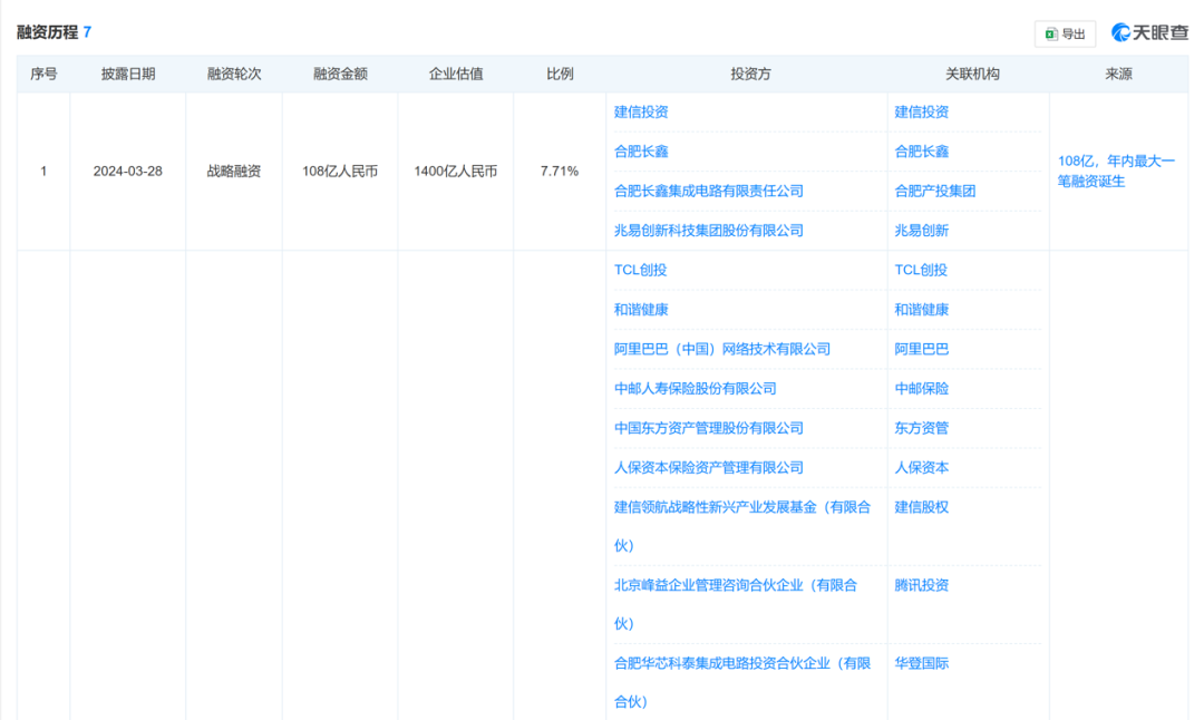 天眼查显示,自2018年启动天使轮融资,长鑫存储的融资历程持续吸引各路资本涌入。截至2024年3月,公司已完成7轮融资,吸引了包括合肥产投、兆易创新、小米科技、美的、阿里巴巴等多家明星创投机构,还有中国人寿、中邮保险等多家险资机构,融资额高达数百亿元,最新投后估值高达1400亿元。