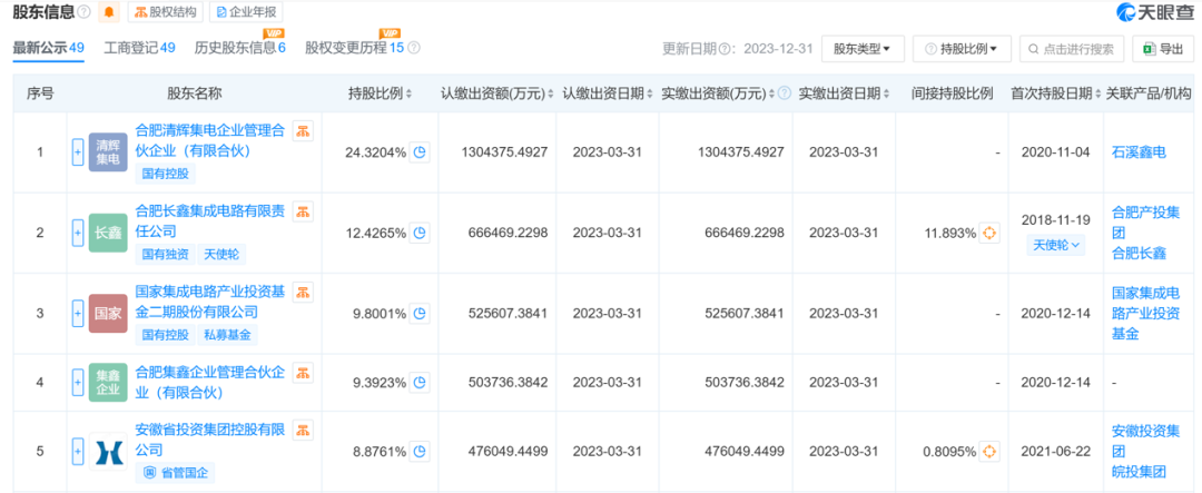 天眼查显示,合肥产投控股的合肥长鑫集成电路有限责任公司持股12.42%,是长鑫存储的第二大股东,国家大基金二期是第三大股东。此外安徽省投资集团也持股8.88%,为第五大股东。