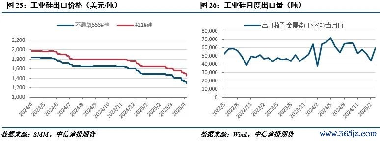 需求情况:多晶硅价格延续跌价,下游采购持续观望,悲观向上传导,难对工业硅形成支撑;有机硅价格趋于平稳,终端需求仍然偏弱,单体厂减产持续,对工业硅需求偏弱;铝合金开工平稳,对工业硅刚需采购;工业硅3月出口同比下降,海外需求偏弱。