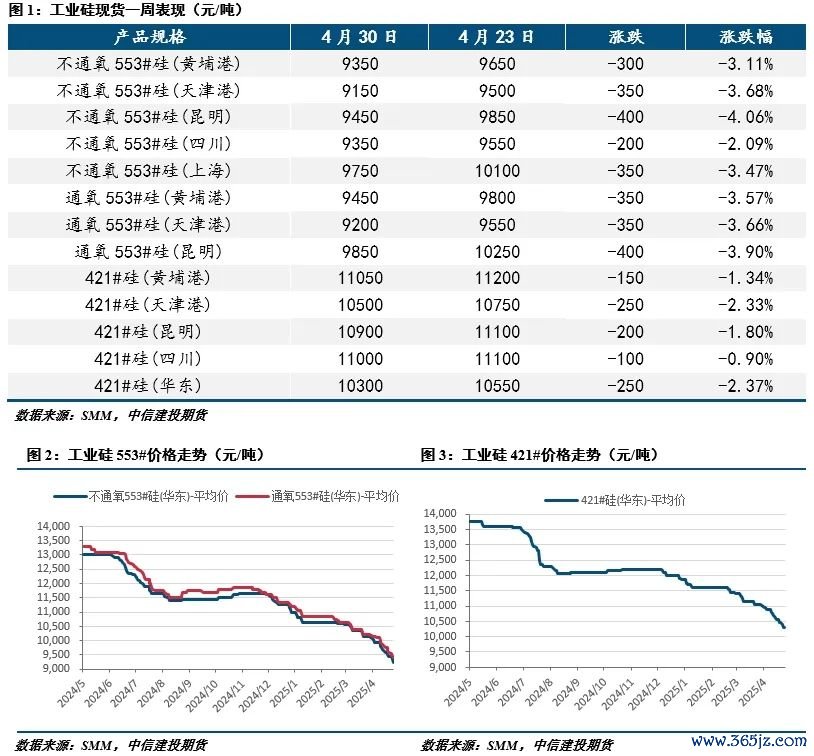 市场运行情况:五一节前一周仅三个交易日,市场维持低迷状态,价格进一步下探,市场悲观情绪难改善。SI2506整周涨跌幅-2.73%,收于8540元/吨。现货市场方面,五一节前备货需求未有明显体现,下游采购需求不足,叠加产业链下游也普遍呈跌价状态,压价心态较强,现货报价进一步走低。