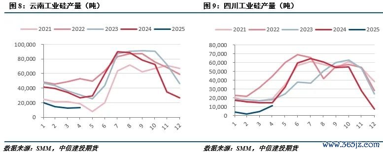 总结:工业硅期货再度触及新低,现货市场持续低迷,下游需求清淡而供应充足,市场总体仍显悲观。从供需来看,西北供应保持稳定,而西南丰水期临近开工有小幅增加迹象,不过由于行业亏损面持续扩大,丰水期西南开工或大幅不及往年,需求端多晶硅开工低位平稳,有机硅仍面临弱势终端需求,工业硅总体需求难有起色。总体来看,短期工业硅供需难有好转,高库存难以去化,工业硅期货或持续底部运行。操作上,观望为主,SI2506合约参考区间8300-8800元/吨。
